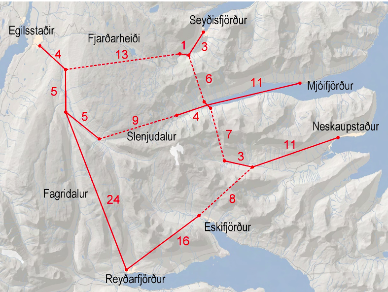 Vegalengdir milli staða um möguleg göng (kort úr skýrslunni Seyðisfjarðargöng frá árinu 2019)
